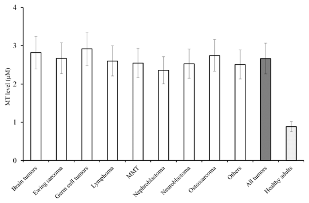 MT levels in serum have seldom been researched in cancer patients. They have been used for monitoring intoxication by metals (lead, cadmium) [47]. Previously, our group has published three publications on MT in serum in adult cancer. Increased MT serum levels in prostate cancer patients were found to be negatively correlated with their Gleason score [48]. MT levels in patients suffering from head and neck spinocellular cancer demonstrated correlation with tumour grade and clinical stage [49,50]. In another study hepatocellular carcinoma serum MT levels were decreased compared to the control group [51]. To our knowledge no work has yet been published on MT serum levels in child cancer patients.