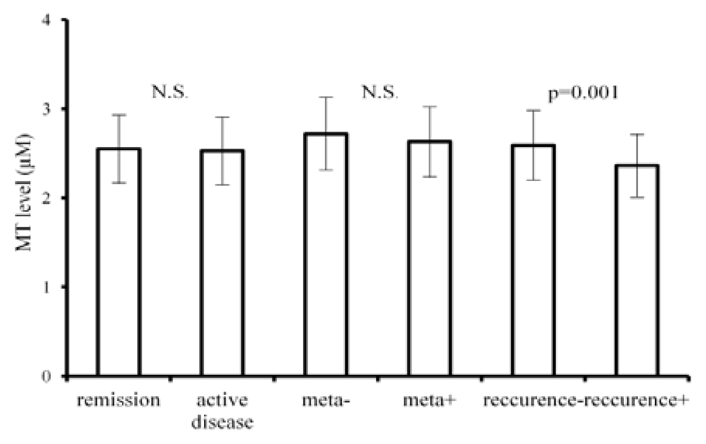 We did not find any differences in MT levels among patients with tumours before starting therapy, with tumour and/or metastases during therapy or with progressive disease (group of “patients with active disease”) and patients in complete remission (group without “active disease”). There were no statistically significant differences in MT levels in patients with metastatic diseases in comparison with levels in patients with localized cancer. The majority patients displaying lower MTs levels had early recurrence of disease. Average MT levels during all follow up period before detection of recurrence was 2.34 μM, versus complete remission 2.67 μM (p = 0.001). These results are shown in Figure 2. We, however, found significant decrease of MT levels in children during follow up ≥2 months after the end of the treatment as compared with levels at the end of therapy (p = 0.001, Figure 3).