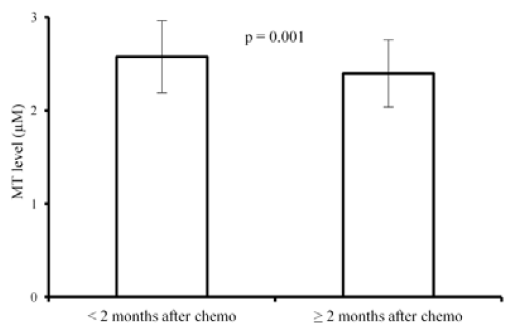 MT levels/mean ± s.d./in group of patients <2 months after finishing chemotherapy compared to patients ≥2 months after finishing chemotherapy [paired T-test (t = 3.53, df = 75) p = 0.001].