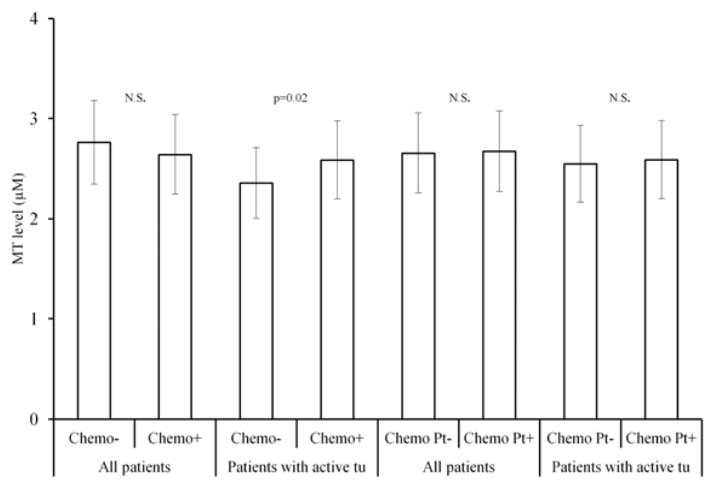 MT levels in patients with active disease were higher in those treated with chemotherapy than without (p = 0.02). There was no significant difference in MT levels in patients treated by protocols containing platinum cytostatics and treated without those cytostatics (Figure 4).