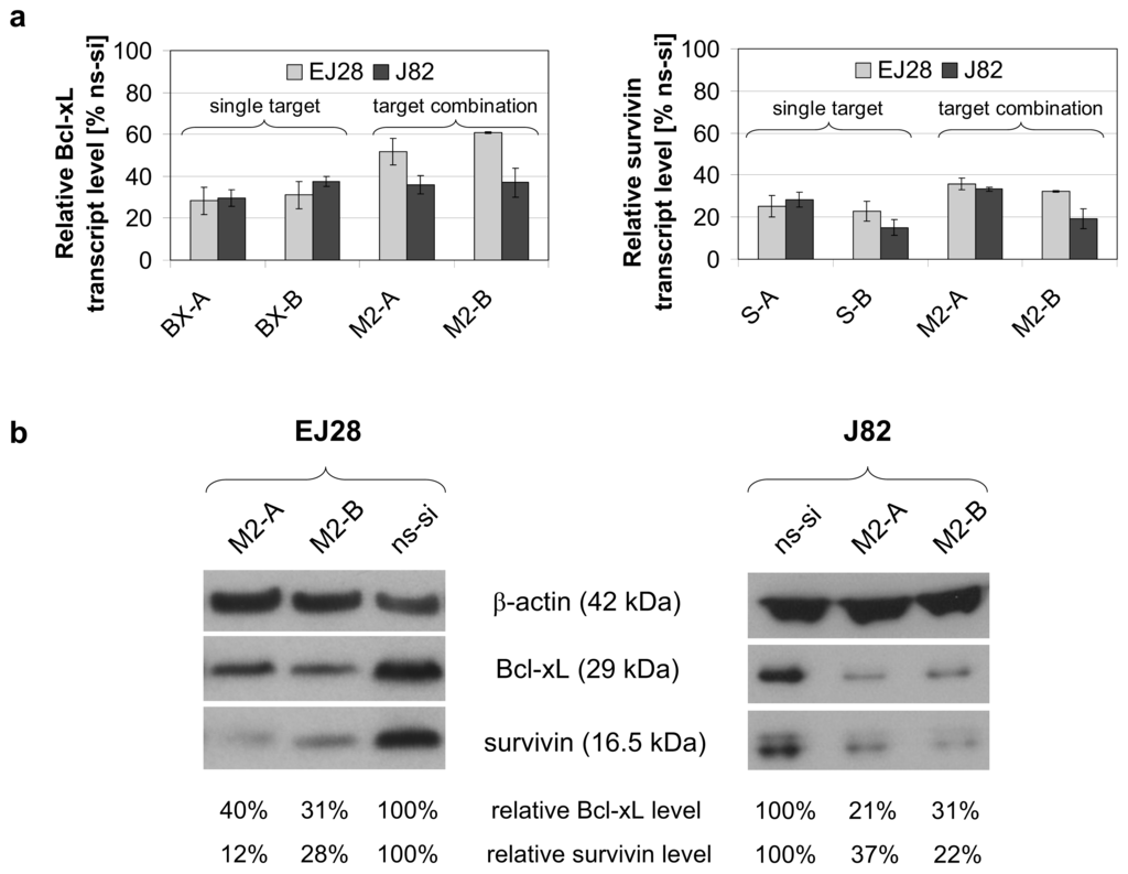 The selected target-specific siRNAs (40 nM) potently decreased the mRNA expression levels of Bcl-xL and survivin by 62%–85% in EJ28 and J82 BCa cells 48 h after transfection (Figure 1a). In the combination treatments M2-A and M2-B, in which both targets were inhibited simultaneously with 20 nM siRNA per target, transcript level reductions by 39%–81% were achieved (Figure 1a). Western Blot analysis verified Bcl-xL and survivin protein knockdown 48 h after siRNA transfection in both BCa cell lines (Figure 1b).