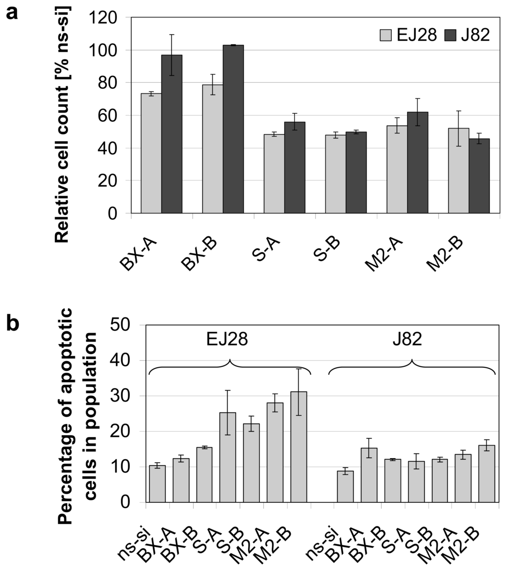 Strong reductions in cell counts, down to 46% compared to the control, were observed after knockdown of survivin as well as after simultaneous inhibition of Bcl-xL and survivin 48 h after transfection (Figure 2a). Apoptosis induction was highest after combined knockdown of both antiapoptotic genes. For example, a 2.7- to 3.0-fold increase in percentage of apoptotic cells was seen in the M2-A and M2-B treatments in EJ28 cells (Figure 2b). This is an increase in apoptosis rate from 10.4% in the ns-si control to 28.1% (M2-A) and to 31.1% (M2-B). In J82 cells, enhancement of apoptosis rate was less prominent. However, percentage of apoptotic cells in population increased from 9% in the ns-si control to up to 16% after M2-B treatment (Figure 2b). The effect of combined siRNA-mediated knockdown of Bcl-xL and survivin on cancer cell apoptosis was additive in EJ28 cells.