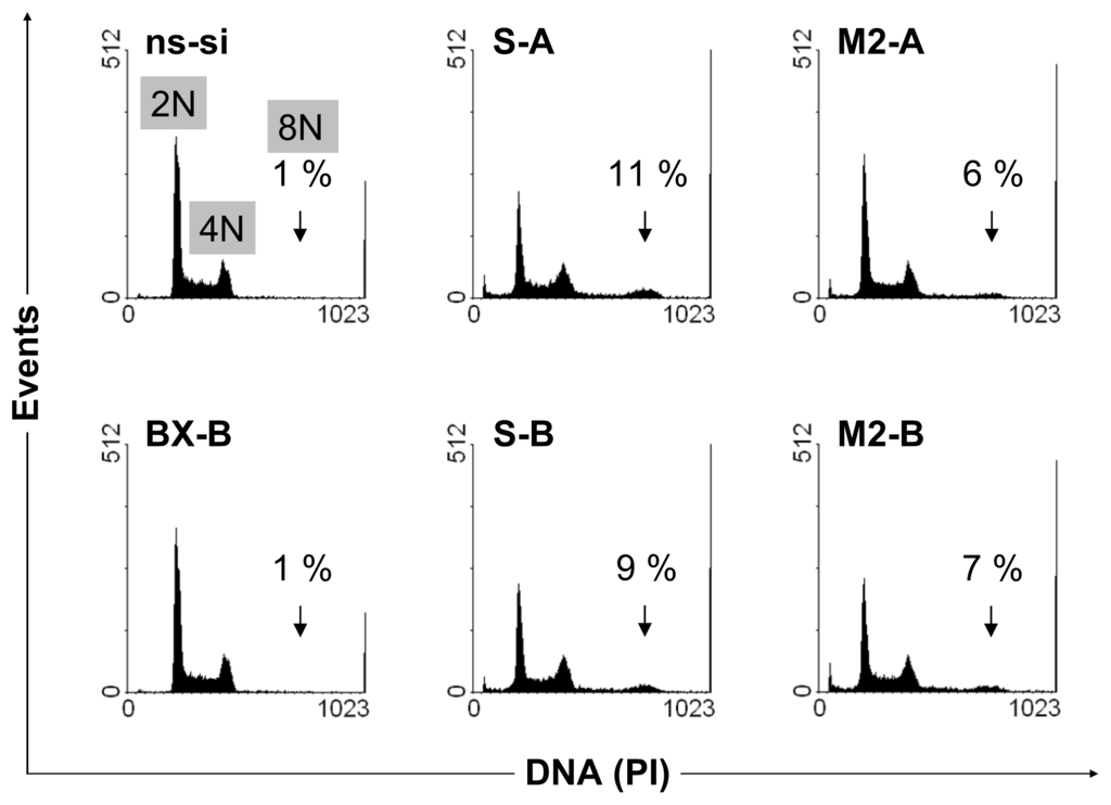 Induction of polyploidy after knockdown of survivin in single target and target combination treatments. DNA content of EJ28 cells, 48 h after single and combined siRNA-mediated inhibition of Bcl-xL and survivin, is shown. Arrows point at polyploid cells with DNA content of 8N. Representative images of two independent experiments are shown.