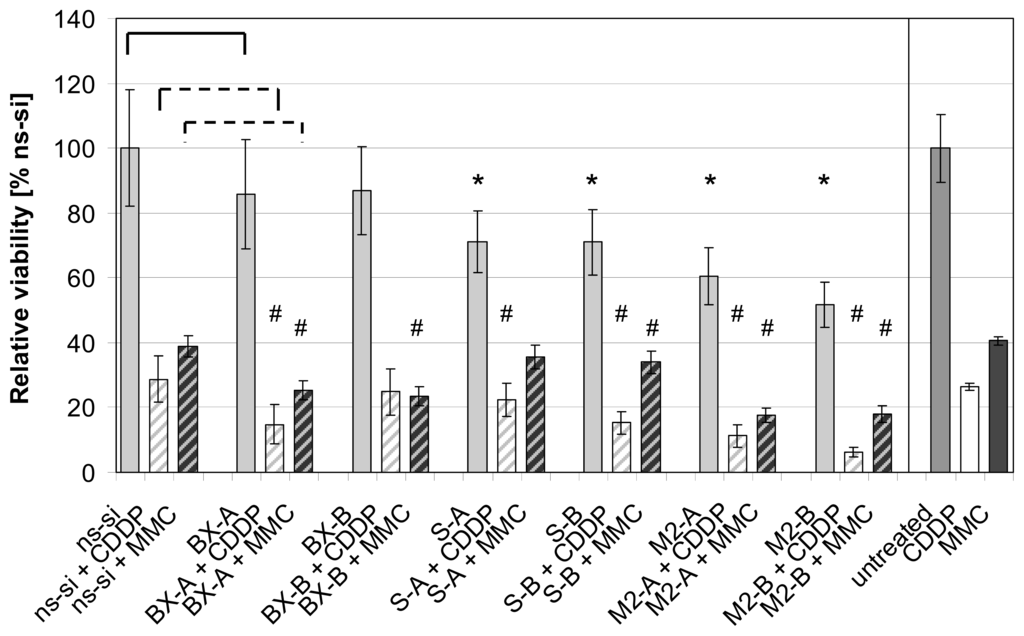 Reductions in viability of EJ28 cells after siRNA-mediated inhibition of Bcl-xL and survivin, with or without subsequent chemotherapy (CT). EJ28 cells were transfected with a total of 40 nM siRNAs for four hours. Twenty-four hours after transfection start, cells were treated with 2.1 μg/mL cisplatin (CDDP) for 24 h or with 0.9 μg/mL mitomycin C (MMC) for two hours. Cell viability was examined 96 h after transfection. Values shown are relative to the control siRNA “ns-si” (=100%, for all siRNA treatments) or relative to untreated cells (only for CDDP and MMC single treatments) and are averages of a fourfold determination. Error bars represent the 95% confidence interval. An unpaired Student’s t-test was used to compare the differences in cell viability between target-specific siRNA and ns-si treated cells (*p ≤ 0.05) as well as between target-specific siRNA + CT and ns-si + CT treated cells (#p ≤ 0.05).