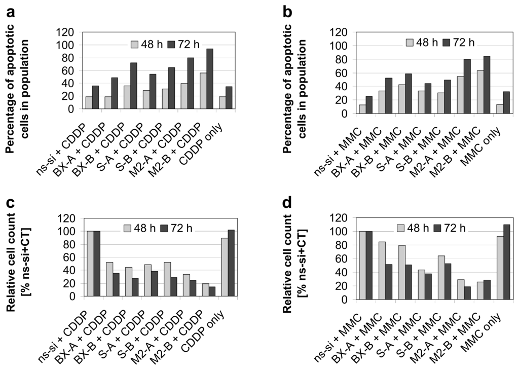 If cells were treated with chemotherapeutics after siRNA transfection the following protocol was applied. Firstly, cells were transfected as described above. Secondly, chemotherapeutics were added 24 h after the start of transfection. Final concentrations of cisplatin and mitomycin C were 2.1 μg/mL and 0.9 μg/mL, respectively, for EJ28 cells. For J82 cells, 1.2 μg/mL cisplatin and 1.0 μg/mL mitomycin C were used. Cisplatin was incubated for 24 h, and mitomycin C for 2 h. Following this, cells were washed once with PBS and were further cultivated with fresh culture medium. The ns-si + chemotherapy combination was used as control to evaluate the siRNA-mediated effects of the treatment.