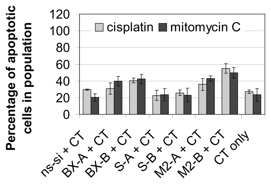 Apoptosis rate after treatment of J82 bladder cancer cells with siRNAs and chemotherapy (CT). Cells were transfected with the respective siRNAs for four hours. “CT only” cells were treated with serum-free OptiMEM medium during transfection. Twenty-four hours after transfection start, cells were treated with 1.2 μg/mL cisplatin for 24 h or with 1.0 μg/mL mitomycin C for two hours. Apoptosis rate—presented as sum of early and late apoptotic cells—was determined 72 h after transfection start. Values shown are averages of two independent experiments. Error bars represent the mean deviation.