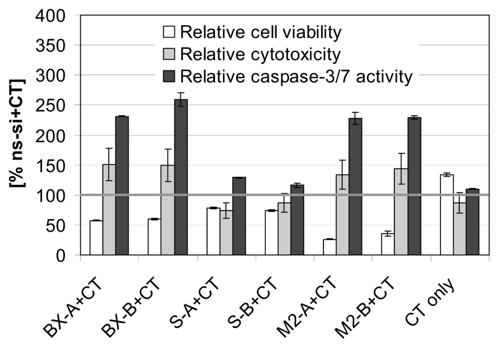 The ApoTox-Glo Triplex Assay (Promega, Mannheim, Germany) enables the consecutive determination of cell viability, cytotoxicity, and apoptosis in the same sample. Cells were seeded into black 96-well culture plates with clear bottoms and were treated with siRNAs with or without subsequent chemotherapy as described above. After treatment, cells were incubated with 100 μL fresh cell culture medium. At 72 h after transfection start, 20 μL Viability/Cytotoxicity Reagent were added to the cells. Following incubation for 1 h, fluorescence was measured with the microplate multimode reader Mithras LB 940 (Berthold Technologies, Bad Wildbad, Germany) at 355Ex/495Em for quantification of cell viability and at 485Ex/535Em for determination of cytotoxicity. Afterwards, 100 μL Caspase-Glo 3/7 Reagent were added to each well. Following incubation for 30 min, luminescence was measeured with the microplate multimode reader.