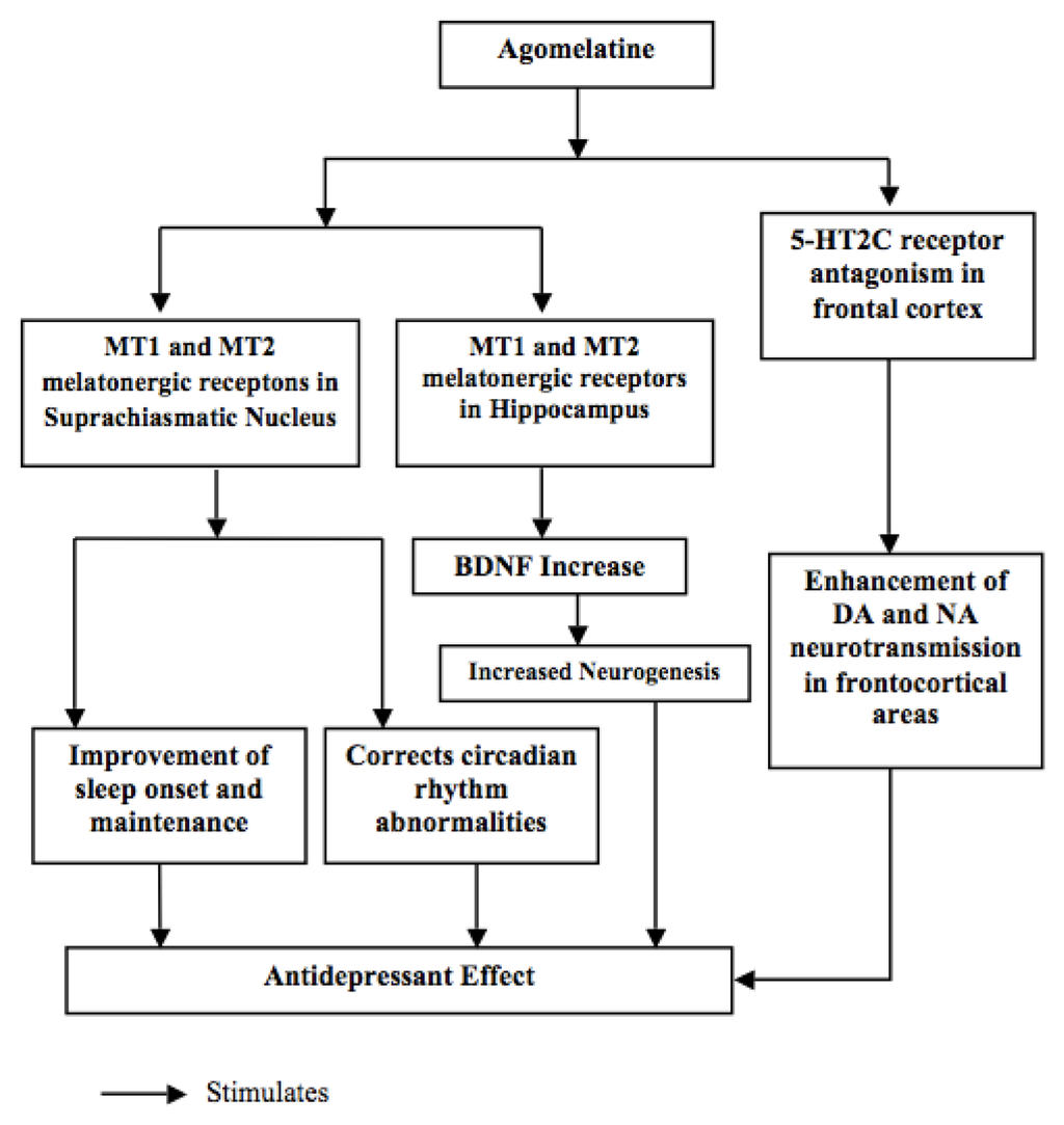 Moreover, in experiments conducted on animals, agomelatine has demonstrated the ability to increase adult hippocampal and prefrontal cortex neurogenesis, to enhance expression of brain-derived neurotrophic factor (BDNF) and to trigger several cellular signals, i.e., protein kinase B (Akt), extracellular signal-regulated kinase 1/2 (ERK1/2) and glycogen synthase kinase 3β (GSK3β) []. It has also been reported that agomelatine may have beneficial effects on hippocampal neurogenesis in the stress-compromised brain of rats []. Most pre-clinical models suggested that either the 5HT2C antagonist effect or the MT1/MT2 agonist effects alone are not sufficient to account for the antidepressant properties of the drug, at least in predictive animal models [–]. Tardito et al. [] proposed that the molecular-cellular effects of agomelatine and, therefore, its antidepressant activity, may be the result of a synergistic action between its agonism at MT1/MT2 and antagonism at 5-HT(2C) receptors. The antidepressant properties of agomelatine, related to its effect on neurogenesis, cell survival, BDNF, activity-regulated cytoskeleton associated protein (Arc) and stress-induced glutamate release, are due to this synergistic action. Intriguingly, agomelatine is the only one able to resynchronize these effectors at distinct levels, circuital and intracellular [].