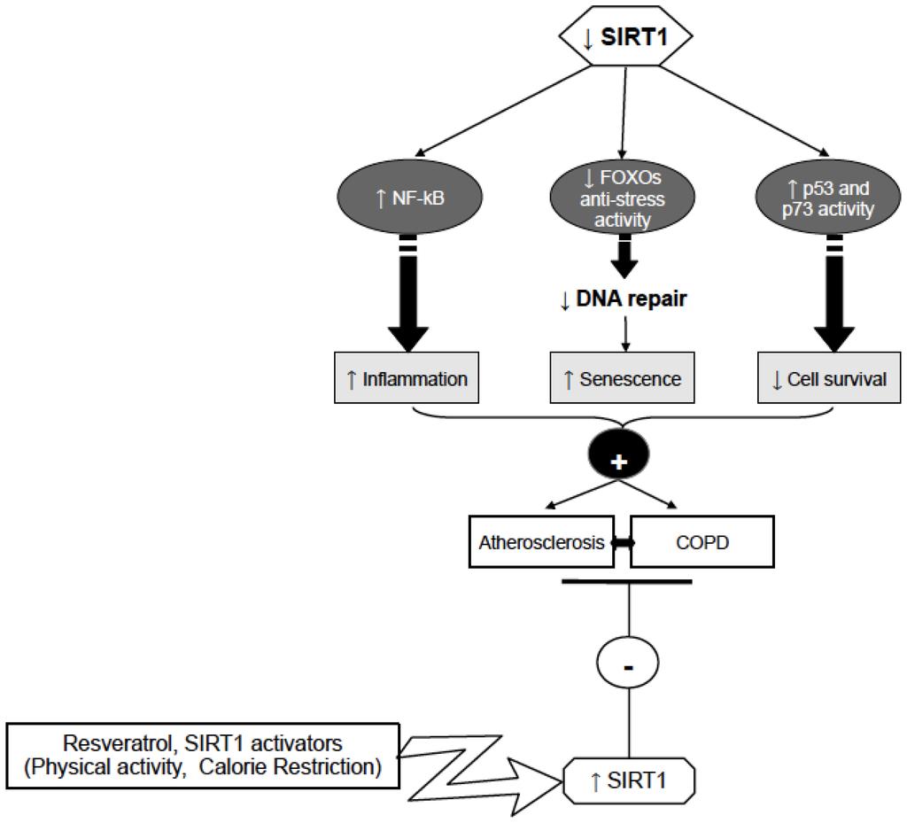 Possible mechanisms involving SIRT1 in Atherosclerosis, and COPD control. Sirt1 activation by activators such as physical activity could prevent atherosclerosis and COPD development through reduction of inflammation (by decreasing NF-κB), and increasing DNA repair (by FOXOs activation) and cell survival (by p53 and p73 activity decrease).