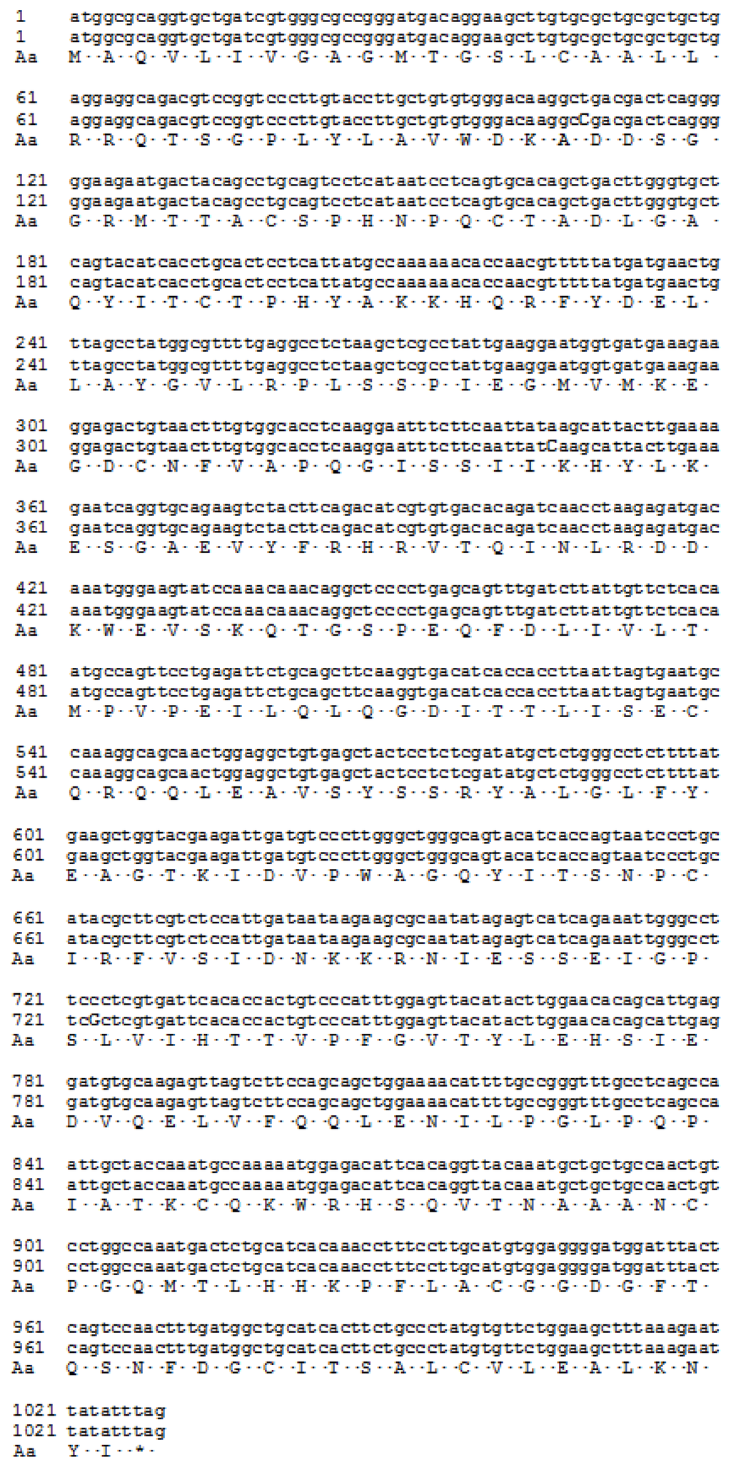 Nucleotide sequences of hRenalase1 ORF available from GenBank (locus NM_001031709.1; upper sequence). hRenalase1 ORF (median sequence) obtained in this study by sequential exon joining, and amino acid sequence of hRenalase1 (lower sequence, a one-letter code). SNPs are shown in bold capital letters.