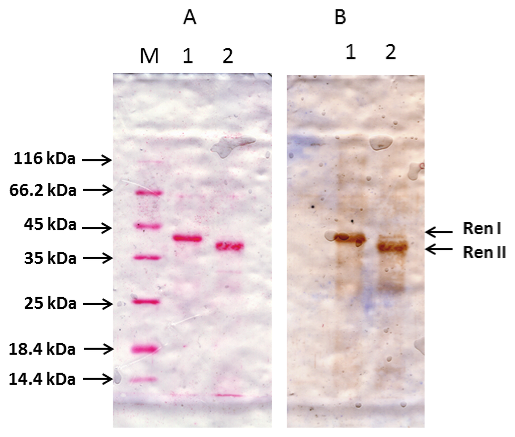 The constructed plasmids pET-RenI and pET-RenII were transformed into E. coli Rosetta (DE3) host cells cultured in the Lysogeny broth (LB) medium containing 50 μg/L kanamycin. The transformed cells were seeded onto LB agar plates containing 50 μg/mL kanamycin. After overnight incubation at 37 °C individual colonies were inoculated into 4 mL of LB-medium containing 50 μg/mL kanamycin and incubated overnight at 37 °C.