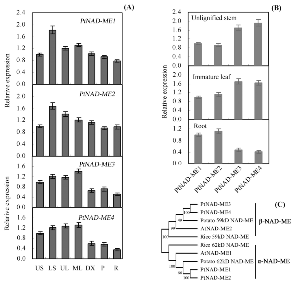 Characterization of the PtNAD-ME gene family in Populus. (A) Analysis of PtNAD-ME gene expression in Populus by real-time PCR. US, unlignified stem (internodes 1–3 from top); LS, lignified stem (from internodes 8–10); UL, immature leaf (from internodes 2–3); ML, mature leaf (from internodes 8–10); DX, developing xylem (from the basal internodes); Phloem (P, from the basal internodes); R, Root; (B) Comparison of four PtNAD-ME gene expression levels in unlignified stem, immature leaf, and root tissues of Populus, respectively; (C) Phylogenetic analysis of the Populus NAD-MEs with other NAD-MEs by neighbor joining method using MEGA 4.0 software. Accession numbers and sources of the NAD-MEs are as follows: AtNAD-ME1 (At2g13560) and AtNAD-ME2 (At4g00570) from Arabidopsis, rice 59 and 62 kDa NAD-MEs (LOC_Os07g31380 and LOC_Os10g35960 ) and potato 59 and 62 kDa NAD-MEs.