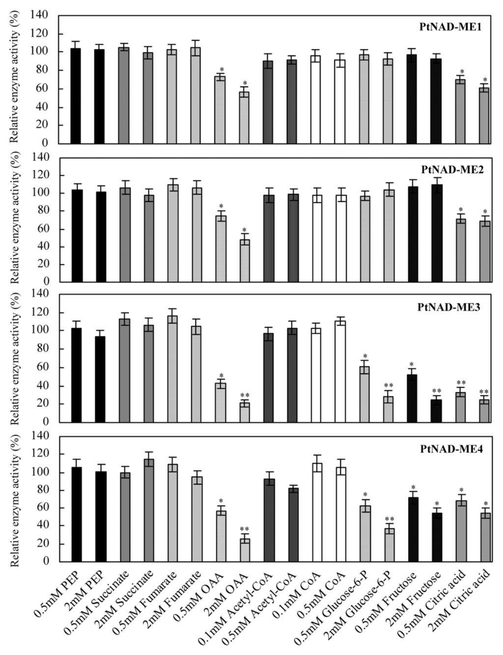 Effect of different metabolites on the activity of each purified PtNAD-ME recombinant proteins. Activities were measured at the optimum pH of each PtNAD-ME in the absence or presence of each effector. The results represent the percent of activity in the presence of each effector relative to the activity measured in the absence of the metabolites (100%, control). Values are presented as the mean of triplicate determinations. * and ** differ significantly from the control with p < 0.05 and p < 0.01, respectively, by Student’s t-test.