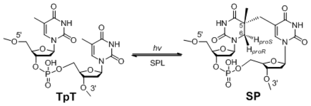 As indicated in Figure 1, the C5 position in 5′-thymine of SP is chiral. It was suggested by Begley to adopt an R configuration, due to the right-handed helical structure of DNA [70]. However, Frediel et al. argued the configuration to be an S configuration [71,72]. After producing the dinucleotide SP TpT via TpT photoreaction in a dry film environment [73], the chiral configuration at the C5 center was confirmed to be R via 2D NMR spectroscopic characterizations [73]. The SP TpT generated exhibited identical properties to that prepared via photo-irradiation of calf thymus DNA, followed by enzyme digestion [26]. Additionally, only the 5R, but not the 5S SP (prepared by chemical synthesis), can be repaired by SPL [68], which is further confirmed by the structure of a formacetal linker containing dinucleotide SP TCH2T [74]. At last, via X-ray structural studies of the dinucleoside SP containing oligonucleotide, Heil et al. showed only the 5R SP isomer can fit in the right-handed duplex structure; while the 5S isomer likely causes severe helical disturbance [75]. All these results suggest the 5R SP TpT to be the truly biologically relevant species.