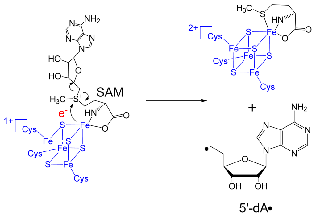 S-adenosylmethionine (SAM) reductive cleavage with the electron provided by the [4Fe-4S]+ cluster to yield the 5′-dA radical and methionine in radical SAM enzymes.