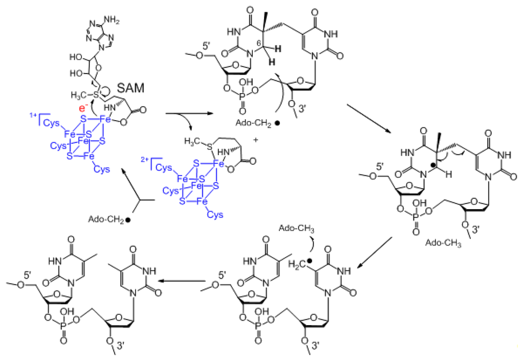 Fontecave et al. re-examined this C141A(Bs) mutant in an in vitro enzymatic study using dinucleotide SP TpT as substrate [64]. After reducing the [4Fe-4S] cluster from the 2+ to 1+ oxidation state by sodium dithionite to initiate the radical SAM reaction, they identified a TpTSO2− species with the SO2− moiety attached to the methyl group of the 3′-thymine allylic radical intermediate as the major repair product (Figure 4). The -SO2− moiety originated from the homolytic cleavage of the S-S bond in dithionite; the resulting •SO2− subsequently combined with the methyl radical to yield TpTSO2−[79]. Such an observation indicates that the C141A mutation disturbs the H-atom back donation step in the SP repair process.