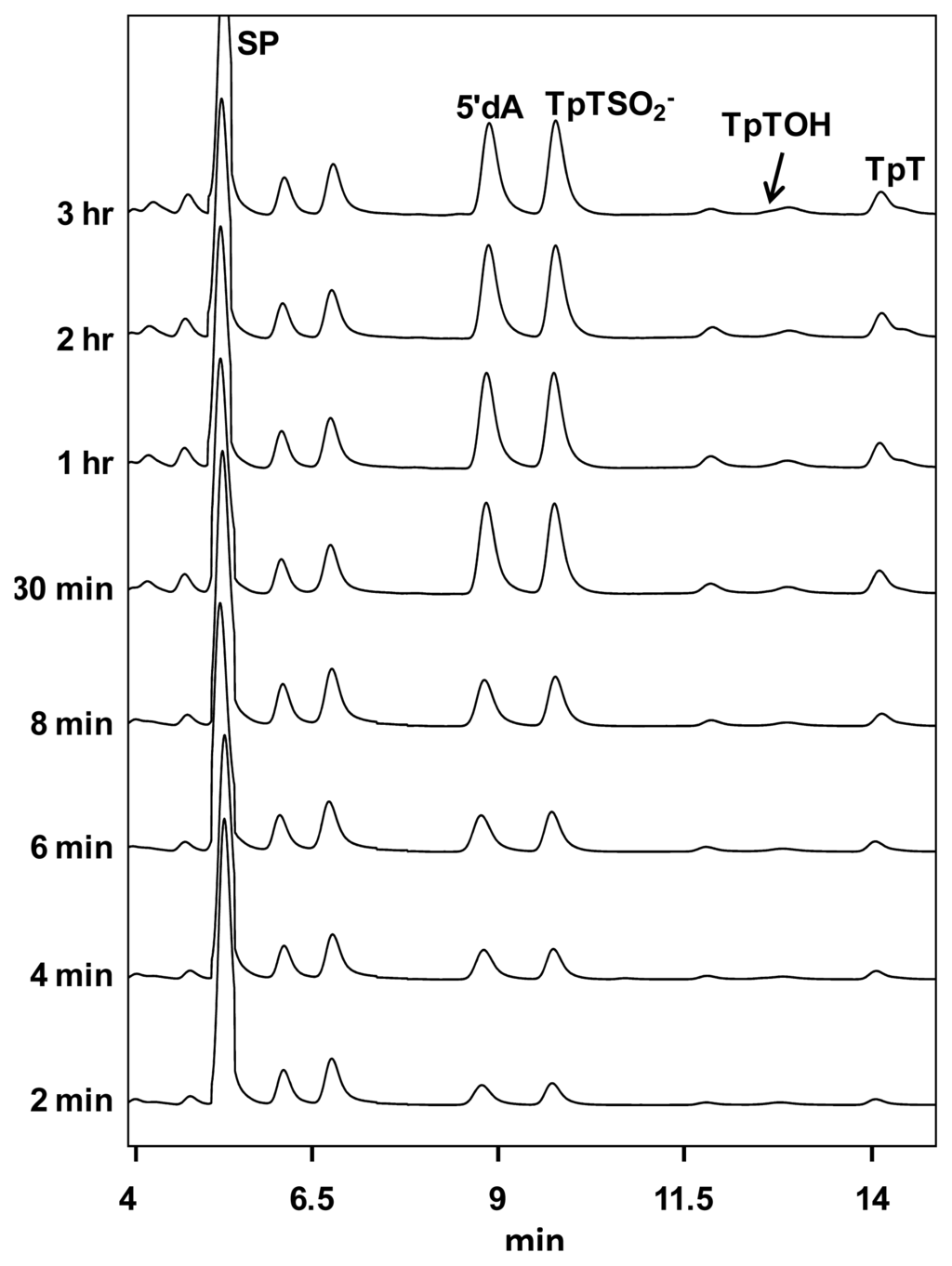 Formation of TpTSO2− after SP TpT repair by the B. subtilis SPL 141A mutant.