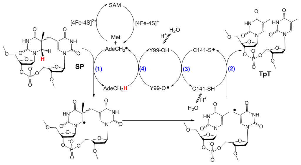 The stereochemistry during the SPL catalysis is now established after these disputes. The previous SPL mechanism was also questioned. The mechanism shown in Figure 3 indicates that 5′-dA is involved in both hydrogen atom transfer steps: the 5′-dA• abstracts an H atom at the 5′-thymine of SP; it has to move down for one nucleotide, roughly 3.4 Å in the framework of a regular B-DNA, to donate the H atom back to the methyl radical at the 3′-thymine, yielding the repaired TpT. Theoretical calculations imply that such a movement requires a dramatic protein conformational change and is unfavorable energetically [76,77]. Later, Fajardo-Cavazos et al. deleted the original uvr and spl genes from the B. subtilis genome and integrated the engineered splB genes carrying different point mutations at the amyE locus, respectively [78]. The B. subtilis SPL (SPL(Bs)) has four conserved cysteine residues, C91, C95, C98 and C141. The first three cysteines are within the radical SAM CXXXCXXC motif; mutating any of these cysteines would drastically destabilize the [4Fe-4S] cluster and deactivate the enzyme [78]. Surprisingly, the C141A mutation equally deactivates SPL, making the corresponding B. subtilis endospores carrying this SPL mutant very sensitive toward UV irradiation [78]. This observation suggests that the fourth cysteine must be involved in enzyme catalysis.