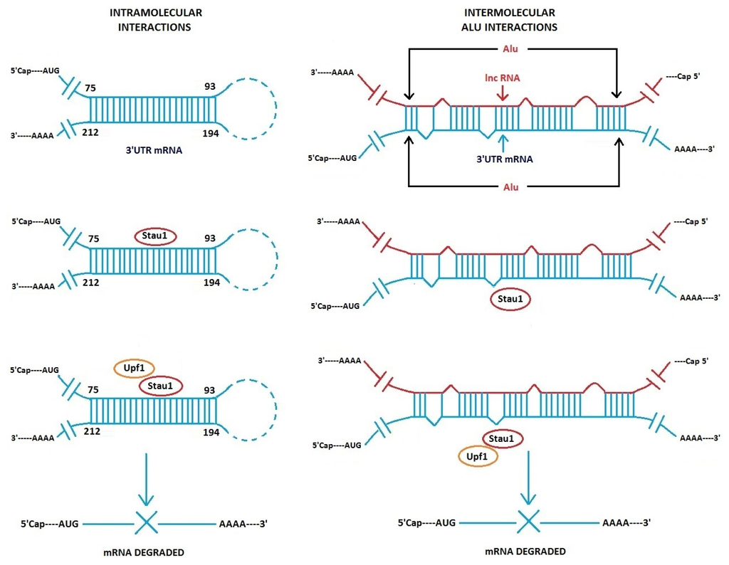 Schematic of binding of Stau1 to 3′ UTR mRNA intramolecular stem (arf1 mRNA) (left) and to intermolecular stem formed by Alu sequence in lncRNA with Alu sequence within 3′UTR mRNA. Upf1is an RNA helicase. The two RNA duplex stems shown are not drawn to scale. Modified from Gong and Maquat [30].