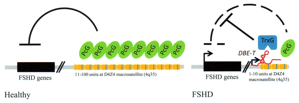 Normal individuals carry a certain number of repeats (11–100) in the facioscpulohumeral (FSHD) locus. FSHD patients have a decreased number of repeats [17]. The FSHD locus maps to the chromosomal region 4q35. The region containing the repeat sequences is termed D4Z4 (Figure 4). A lncRNA termed DBE-T is partly encoded by the D4Z4 repeat locus at its 3′ end. The genomic repeat sequences serve as binding sites for Polycomb proteins (PcG). PcG proteins have multiple functions but are epigenetic suppressors and are needed to suppress the FSHD genes that are silent in normal individuals. However, when there is a loss of genomic repeats resulting in less than 11 repeats, as is found in FSHD patients, DBE-T lncRNA transcription is activated. The RNA is normally silent and is only detected in FSHD patients. DBE-T lncRNA recruits Ash1L, a histone methytransferase to the FHDS locus, which subsequently results in transcription of locus genes due to epigenetic changes in chromatin. Thus these are changes involving the loss of repeat sequences in the D4Z4 region, transcription of a lncRNA with resultant chromatin remodeling and transcription of normally silent genes from the FSHD locus (Figure 4).