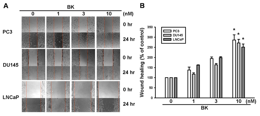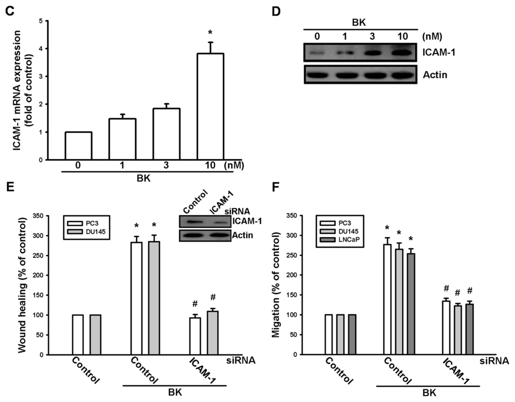 Recently, BK has been reported to mediate the invasion and migration of human cancer cells [,]. Here, we exogenously applied BK to prostate cancer cell lines and observed induced cell motility. Exogenously applied BK is representative of the in vitro endocrine effect of BK. Previous studies used BK (3–10 nM) as a pathological condition [,]. In the current study, we also applied BK at a concentration of 10 nM to induce ICAM-1 expression and cell motility. Therefore, 10 nM BK represents a pathological condition in prostate cancer metastasis.