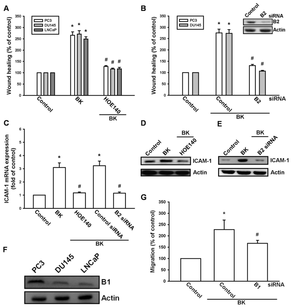 Bradykinin (BK) increased cell migration and intercellular adhesion molecule 1 (ICAM-1) expression through the B2 receptor. (A,B) Cells were pretreated with B2 receptor antagonist HOE140 (10 nM) for 30 min or transfected with B2 small interfering RNA (siRNA) for 24 h followed by stimulation with BK (10 nM). The in vitro migration was measured by using a wound-healing migration assay; (C–E) PC3 cells were pretreated with the B2 receptor antagonist HOE140 (10 nM) for 30 min or transfected with B2 siRNA for 24 h followed by stimulation with BK (10 nM) for 24. The mRNA and protein levels of ICAM-1 were determined by quantitative polymerase chain reaction (PCR) and Western blotting, respectively; (F) Total proteins were extracted from PC3, DU145, and LnCaP cells and subjected to Western blotting for B1 receptor detection; (G) PC3 cells were transfected with B1 siRNA for 24 h followed by stimulation with BK (10 nM). The in vitro migration was measured by using a Transwell assay. Results are expressed as the mean ± SE. *p < 0.05 compared with control. #p < 0.05 compared with BK-treated group.