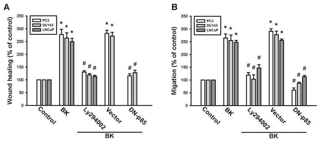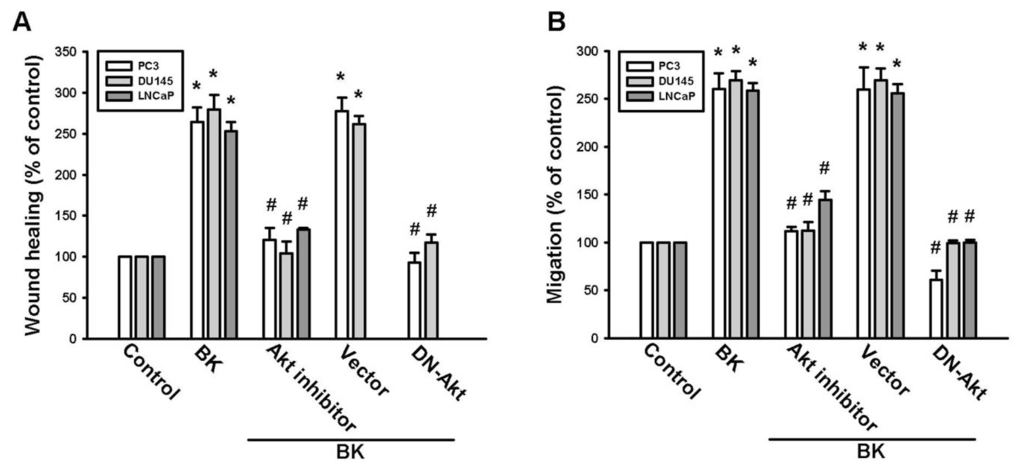 PI3K-dependent Akt activation has been shown to play an important role in BK-mediated cellular functions [,,]. We demonstrated that treatment with a PI3K inhibitor and Akt inhibitor inhibited BK-induced cell motility and ICAM-1 expression, suggesting that PI3K/Akt activation is a requisite event in BK-increased cell migration in prostate cancer cells. This was confirmed by the observation that p85 and Akt mutants inhibited the increased migration and ICAM-1 expression in human prostate cancer cells. These results suggest that the PI3K-dependent Akt activation is required for BK-induced expression of ICAM-1 and cell migration. In contrast, we previously reported that BK increased prostate cancer migration through the protein kinase Cδ (PKCδ)/c-Src signaling pathway []. In this study, we also provide evidence that PI3K/Akt is involved in BK-increased prostate cancer cell migration. Previous studies have reported that the PKCδ/c-Src pathway interacts with the PI3K/Akt pathway in different cell types [,]. However, we did not examine the interaction between the PKCδ/c-Src and PI3K/Akt pathways in prostate cancer cells. Whether PKCδ/c-Src interacts with PI3K/Akt after BK stimulation needs further examination.