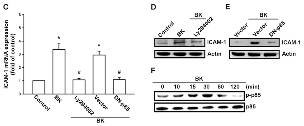 BK was purchased from Calbiochem (San Diego, CA, USA). Anti-mouse and anti-rabbit IgG-conjugated horseradish peroxidase, rabbit polyclonal antibodies specific forp85, p-p85, Akt, p-Akt (Ser473), c-Jun, p-c-Jun, ICAM-1,β-actin, and siRNA against ICAM-1, c-Jun, and control (negative control for experiments using targeted siRNA transfection; each consisted of a scrambled sequence that would not cause specific degradation of any known cellular mRNA) were purchased from Santa Cruz Biotechnology (Santa Cruz, CA, USA). The B2 receptor antagonist HOE140 was purchased from Tocris Bioscience (Ellisville, MO, USA). Ly294002 and Akt inhibitor (1L-6-hydroxymethyl-chiro-inositol-2-((R)-2-Omethyl-3-O-octadecylcarbonate)) were purchased from Calbiochem. The AP-1 luciferase plasmid was purchased from Stratagene (La Jolla, CA, USA). The p85 (Δp85; deletion of 35 amino acids, i.e., residues 479 513, of p85) and Akt (Akt K179A) dominant-negative mutants were gifts from Dr. W.M. Fu (National Taiwan University, Taipei, Taiwan). The pSV-β-galactosidase vector and luciferase assay kit were purchased from Promega (Madison, MA, USA). All other chemicals were purchased from Sigma–Aldrich (St. Louis, MO, USA).