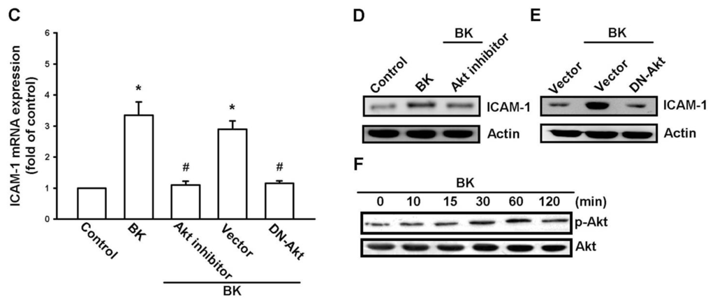 The Akt pathway is involved in BK-mediated migration and intercellular adhesion molecule 1 (ICAM-1) expression in human prostate cancer cells. (A,B) Cells were pretreated for 30 min with Akt inhibitor (10 μM) or transfected with Akt mutant for 24 h followed by stimulation with BK (10 nM). The in vitro migration was measured by using wound-healing and Transwell assays; (C–E) PC3 cells were pretreated for 30 min with an Akt inhibitor (10 μM) or transfected with an Akt mutant for 24 h followed by stimulation with BK (10 nM). The mRNA and protein levels of ICAM-1 were determined by quantitative polymerase chain reaction and Western blotting, respectively; (F) PC3 cells were incubated with BK (10 nM) for the indicated time intervals, and Akt phosphorylation was examined by Western blotting. Results are expressed as the mean ± SE. *p < 0.05 compared with control. #p < 0.05 compared with BK-treated group.