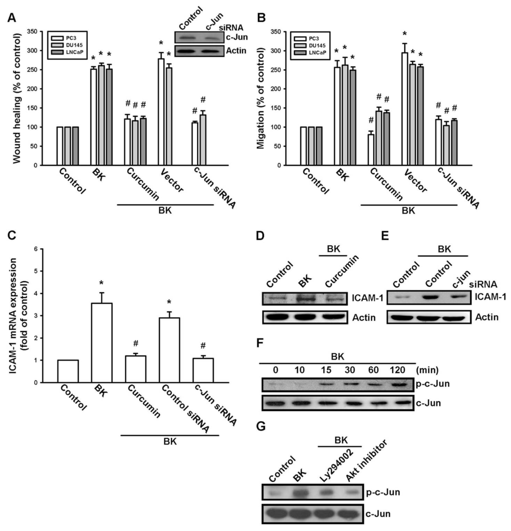 A previous study has shown that AP-1 activation mediates ICAM-1 expression and metastasis in human prostate cancer cells []. To examine whether AP-1 activation is involved in the signal transduction pathway leading to BK-induced increased ICAM-1 expression and cell motility, the AP-1 inhibitor curcumin [] was used. Curcumin antagonized the increase in the migration and ICAM-1 expression induced by BK (Figure 5A–D). AP-1 activation was further evaluated by analyzing c-Jun activation. Transfection of cells with c-Jun siRNA reduced the BK-mediated increase in cell migration and ICAM-1 expression (Figure 5A–C,E). Stimulation of cells with BK increased c-Jun phosphorylation (Figure 5F). Furthermore, pretreatment of cells with Ly294002 or an Akt inhibitor reduced the BK-induced c-Jun phosphorylation (Figure 5G). These data indicate that AP-1 is involved in BK-mediated cell migration and expression of ICAM-1 in human prostate cancer cells.