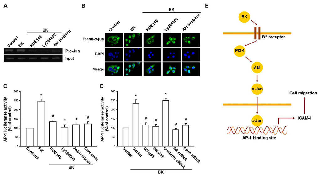 Bradykinin (BK) induced AP-1 activation through the B2 receptor/PI3K/Akt pathway. (A) PC3 cells were pretreated with HOE140, Ly294002, or Akt inhibitor for 30 min and then stimulated with BK (10 nM) for 120 min. Next, a chromatin immunoprecipitation assay was performed. Chromatin was immunoprecipitated with a c-Jun antibody. The precipitated chromatin was used as a loading control (input); (B) PC3 cells were pretreated with HOE140, Ly294002 or Akt inhibitor for 30 min and then stimulated with BK (10 nM) for 120 min, c-Jun immunofluorescence staining was then observed; (C) PC3 cells were pretreated with HOE140, Ly294002, Akt inhibitor, and curcumin for 30 min or (D) transfected with a p85 mutant and an Akt mutant and with B2 and c-Jun small interfering RNAs before exposure to BK (10 nM). AP-1 luciferase activity was measured; the results were normalized to β-galactosidase activity and expressed as the mean ± SE of 3 independent experiments performed in triplicate. Results are expressed as the mean ± SE. *p < 0.05 compared with control. #p < 0.05 compared with BK-treated group; (E) Schematic presentation of the signaling pathways involved in BK-induced cell migration and ICAM-1 expression of human prostate cancer cells. BK activates B2 receptor, PI3K, and Akt pathways, which in turn induce AP-1 activation, which leads to ICAM-1 expression and increases the migration of human prostate cancer cells.