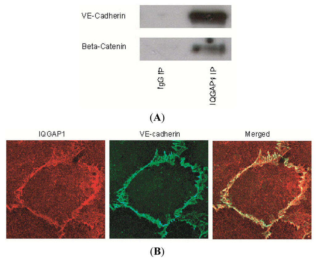 Using immunoprecipitation and immunofluorescence microscopy we first examined whether IQGAP1 associates with proteins of the adherens junction in HUVEC monolayers. Control cell lysates were incubated with an antibody to IQGAP1 or IgG (the latter to determine antibody specificity). Immunoprecipitates were resolved by SDS-PAGE and probed with antibodies to various adherens junction proteins. The adherens junction proteins, VE-cadherin and β- (Figure 1A), as well as γ-, α-, and p120-catenins (Figure S1), formed specific complexes with IQGAP1. Localization of IQGAP1 in confluent endothelial cell monolayers was also viewed by immunofluorescence microscopy following co-incubation with primary antibodies to IQGAP1 and VE-cadherin (Figure 1B) or one of the catenins, β-, γ-, α-, or p120- (Figure S1). IQGAP1 was localized in the cytoplasm and at cell-cell contacts (Figure 1B, IQGAP1). In the cytoplasm, IQGAP1 was evenly distributed at an intermediate level. At the intercellular junctions, IQGAP1 co-localized with VE-cadherin (Figure 1B, Merged) and the catenins at a higher level.