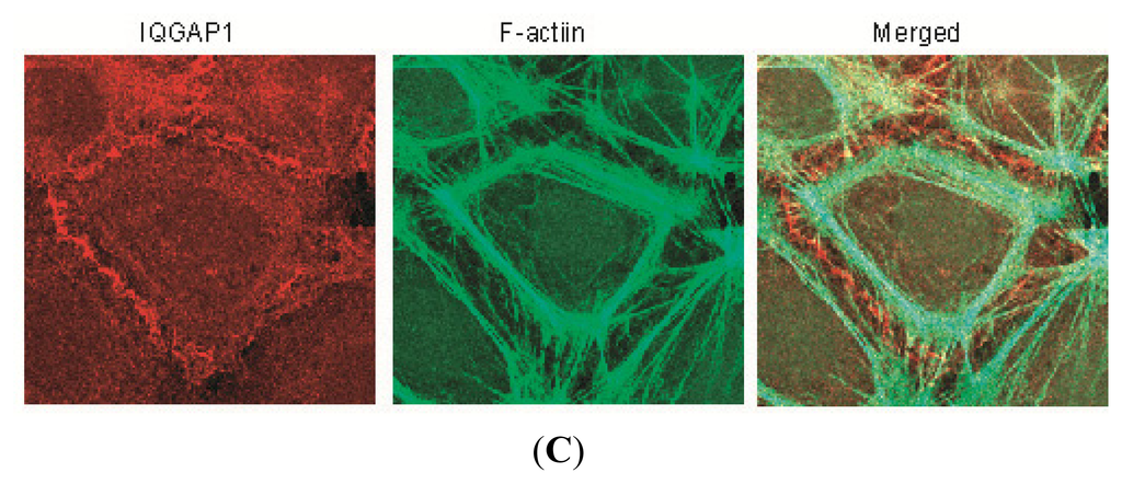 IQGAP1 is a scaffolding protein that binds directly to the adherens junction proteins, E-cadherin and ß-catenin, and co-localizes with these proteins at cell-cell contacts in mouse L fibroblasts expressing E-cadherin (EL cells) and in Madin Darby Canine Kidney (MDCK) epithelial cells [12]. Kaibuchi and co-workers hypothesize that the binding of IQGAP1 to ß-catenin competitively interferes with the binding of α-catenin to the E-cadherin/β-catenin complex and dissociates cell-cell adhesion, presumably by unlinking the complex from the actin cytoskeleton [12–14]. However, IQGAP1 also binds to filamentous actin and functions to cross-link and stabilize actin filaments [15,16] via its calponin homology (CH) domain at the N-terminus. Therefore, the exact role of IQGAP1 in the regulation of endothelial cell-cell adhesion needs to be determined.