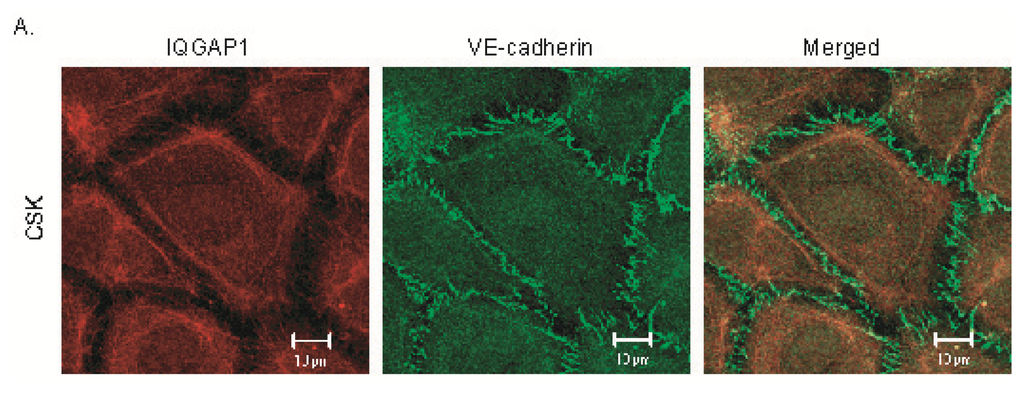 Cytoskeleton buffer containing 0.5% Triton X-100 (CSK-Tx buffer), a non-ionic detergent, was used to extract labile proteins not linked to the cytoskeleton under near physiological conditions of ionic strength and pH [17]. To determine whether the junctionally-located IQGAP1 observed in Figure 1 was associated with the cytoskeleton, HUVEC monolayers were permeabilized with CSK-Tx buffer to remove labile proteins, and then fixed with 4% paraformaldehyde. In control cells, IQGAP1 and VE-cadherin were found at cell-cell contacts (Figure 1B). However, IQGAP1 disappeared from most intercellular junctions after removal of labile proteins by the permeabilizing buffer, indicating that most junctionally-located IQGAP1 is labile and not bound to the cytoskeleton (Figure 2A, IQGAP1). However, the majority of stable VE-cadherin still remained at intercellular junctions, suggesting that most junctional VE-cadherin is bound to actin filaments (Figures 1B and 2A, VE-cadherin). In contrast, stable IQGAP1 was found to bind to the cortical cytoskeleton (Figure 2B, IQGAP1) while junctional IQGAP1 was not (Figure 1C).