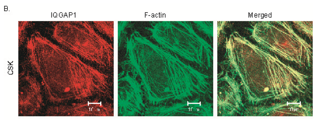 Labile IQGAP1 at intercellular junctions and Stable IQGAP1 in the cortex. HUVEC monolayers were permeabilized with Cytoskeleton buffer containing 0.5% Triton X-100 (CSK-Tx buffer) to remove labile proteins. (A) After CSK-Tx Buffer was added, IQGAP1 was only visualized in the cortex (Red), but not at the junctions. However, VE-cadherin was still seen at the junctions (Green); (B) After CSK-Tx Buffer was added, IQGAP1 was only visualized in the cortex (Red), and colocalizes with F-actin (Yellow).