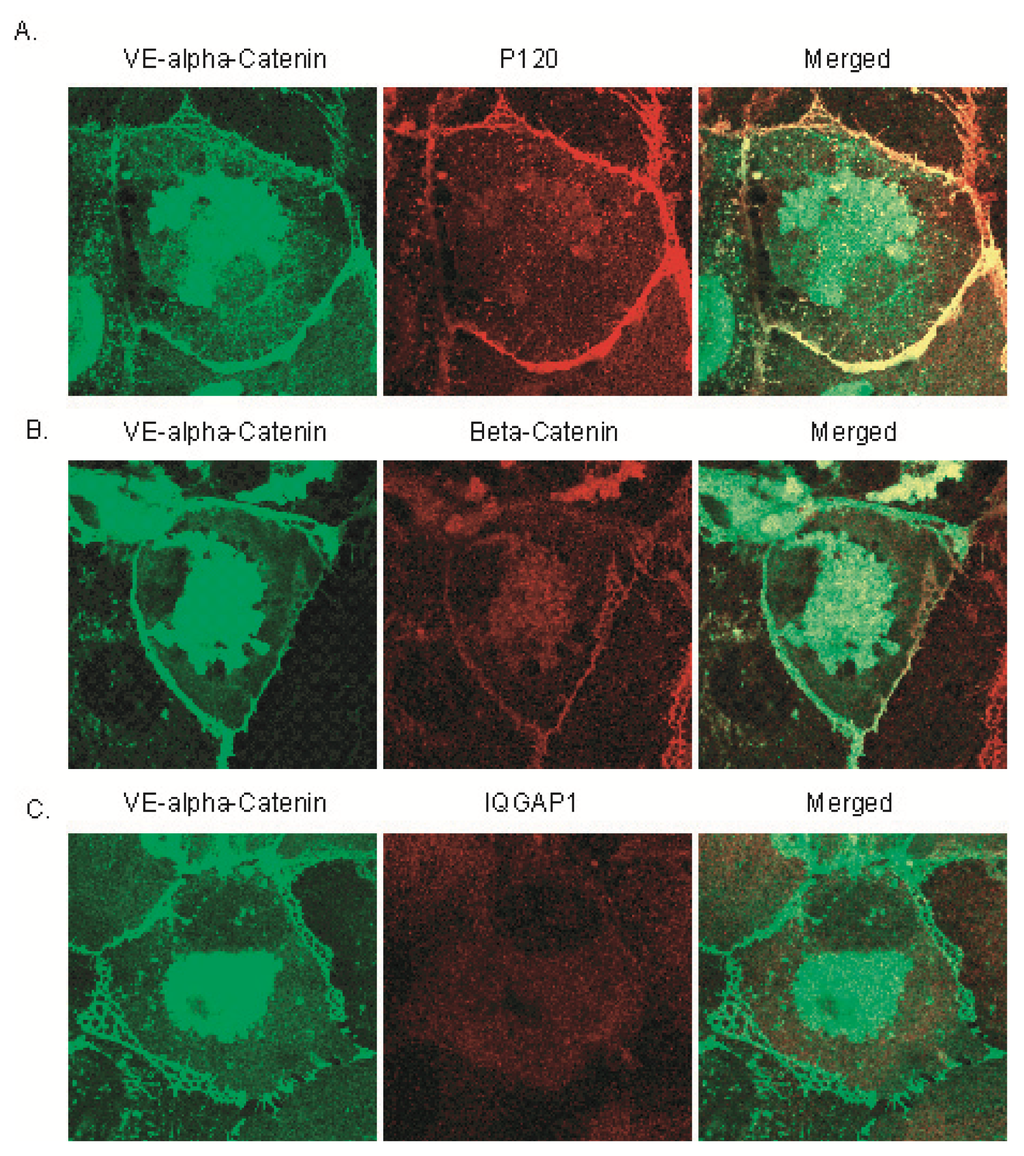 To further study the interaction of IQGAP1 with VE-cadherin, β- and α-catenins, we infected HUVECs with adenoviral vectors expressing GFP labeled VE-α-catenin that consisted of the extracellular domain, transmembrane domain of VE-cadherin and the actin binding domain of α-catenin (without the β-catenin binding domain) (Figure 4A). Localization of IQGAP1 in HUVEC cells expressing GFP-VE-α-catenin was also viewed by immunofluorescence microscopy following co-incubation with primary antibodies to IQGAP1, β-, or p120-catenin (Figure 3). GFP labeled VE-α-catenin IQGAP1 was clearly found both in the cytoplasm and at cell-cell contacts (Figure 3, VE-α-catenin). In the cytoplasm, VE-α-catenin was aggregated around the nucleus; at the cell periphery, VE-α-catenin co-localized with endogenous p120- and β-catenins (Figure 3, Merged). Endogenous p120- and β-catenins only bind to endogenous VE-cadherin since VE-α-catenin lacks the intracellular domain of VE-cadherin. However, endogenous VE-cadherin can still form clusters with exogenous VE-α-catenin through the extracellular domain. VE-α-catenin is always connected to actin filaments and therefore overexpression of VE-α-catenin results in compaction of adherens junctions. Endogenous IQGAP1expression was diminished at the intercellular junctions (Figure 3, IQGAP1) and significantly reduced in the cytoplasm, compared with control cells (Figure 1, IQGAP1) - suggesting that endogenous IQGAP1 is excluded from clusters of endogenous VE-cadherin and exogenous VE-α-catenin. The colocalization of VE-α-catenin and p120- or β-catenins (Figure 3A,B) at intercellular junctions indicates that both p120- and β-catenins are still connected to cytoskeleton similar to endogenous VE-cadherin (Figure 2A). Thus, the clusters of VE-cadherin and catenins at intercellular junctions now consist of both exogenous VE-α-catenin and endogenous VE-cadherin-(β-, p120- and α-) catenins, but the labile pool of IQGAP1 was excluded from the compacted adherens junctions (also in Figure 2A).