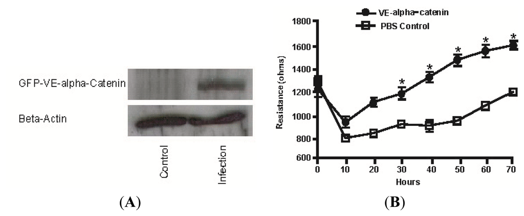 Expression of GFP labeled VE- α-catenin increases the electrical resistance across HUVEC monolayers. HUVECs were transfected with adenoviral vectors expressing GFP-labeled VE- α-catenin. (A) Equal amounts of protein lysates were immunoblotted for GFP or β actin. Control group was treated with PBS; (B) HUVECs were infected in six-well dishes for 48 h, and then trypsinized and seeded in the ECIS wells. Basal electrical resistance of HUVEC monolayer was increased by 64% from 10 to 70 h after infection (n = 4 for PBS treated group, n = 4 for GFP-VE- α-catenin expressing group).