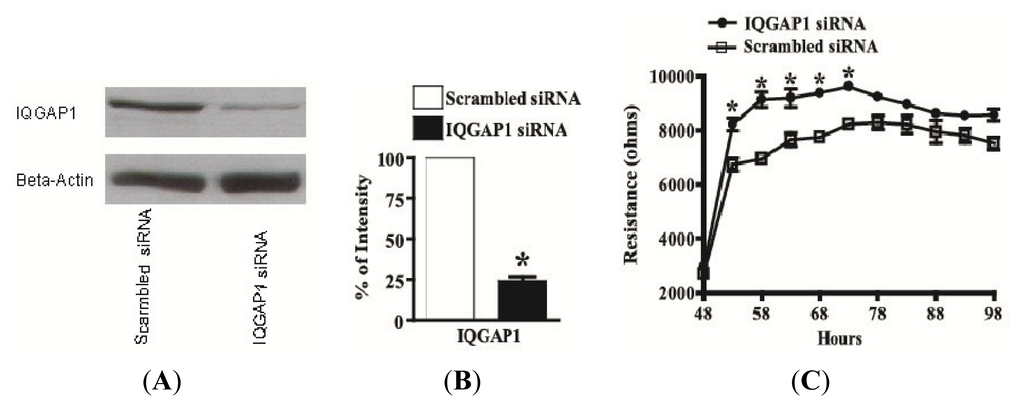 IQGAP1 knock-down increases basal resistance of HUVECs. HUVECs were transfected with 0.4 uM IQGAP1 siRNA or scrambled siRNA. (A) Equal amounts of protein lysate from cells transfected with scrambled siRNA and IQGAP1 siRNA were immunoblotted for IQGAP1 and β-actin; (B) The relative amounts of IQGAP1 in cells transfected with scrambled siRNA and IQGAP1 siRNA were quantified, and 75% IQGAP1 was knocked down by siRNA (n = 16); (C) HUVEC monolayers were transfected in six-well dishes for 48 h, then trypsinized and seeded in ECIS wells. Basal electrical resistance of HUVEC monolayers was continuously monitored by ECIS and resistance across cells transfected with IQGAP1 siRNA was higher than that with scrambled siRNA (n = 7). *p < 0.05 vs.scrambled siRNA at specific time points.