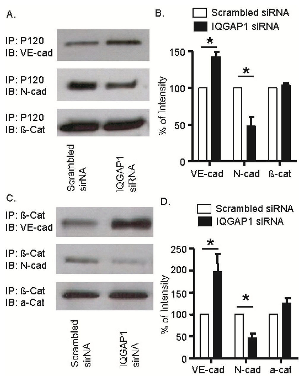 To understand the cellular mechanism for the higher endothelial electrical resistance in IQGAP1 siRNA-treated cells, we determined if the reduction in IQGAP1 affected the association of VE-cadherin and N-cadherin with the catenins. Lysates from HUVEC cells transfected with IQGAP1 siRNA or scrambled siRNA for 48 h were incubated with antibodies to p120 or β-catenin. The resultant immunoprecipitates were subjected to SDS-PAGE and probed with antibodies to VE- cadherin, N-cadherin, and β- and α-catenins. Association of VE-cadherin with p120 was increased by almost 50% (Figure 6A,B) and with β-catenin by ~60% (Figure 6C,D). In contrast, the association of N-cadherin with both p120 (Figure 6A,B) and β-catenin (Figure 6C,D) was decreased by 50%. Associations of p120 with β-catenin (Figure 6A,B) and of β-catenin with α-catenin (Figure 6C,D) were not changed by transfection with IQGAP1 siRNA.