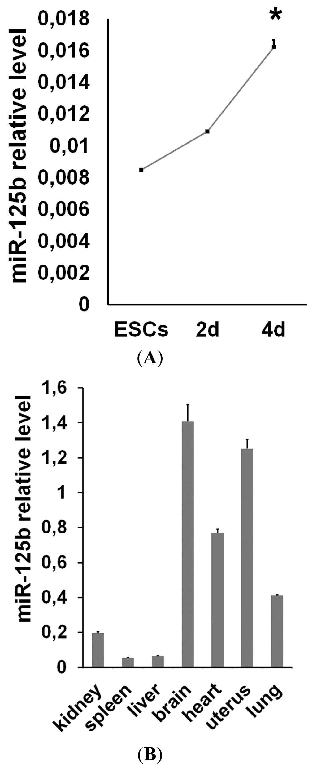 miR-125b expression in embryonic stem cells (ESCs) and mouse tissues. (A) miR-125b expression levels were analyzed by qPCR in undifferentiated ESCs and during neural differentiation through serum-free embryoid bodies (SFEBs) formation; (B) Analysis of miR-125b expression in mouse adult tissues. The data were normalized to the U6 internal control (*p < 0.05).