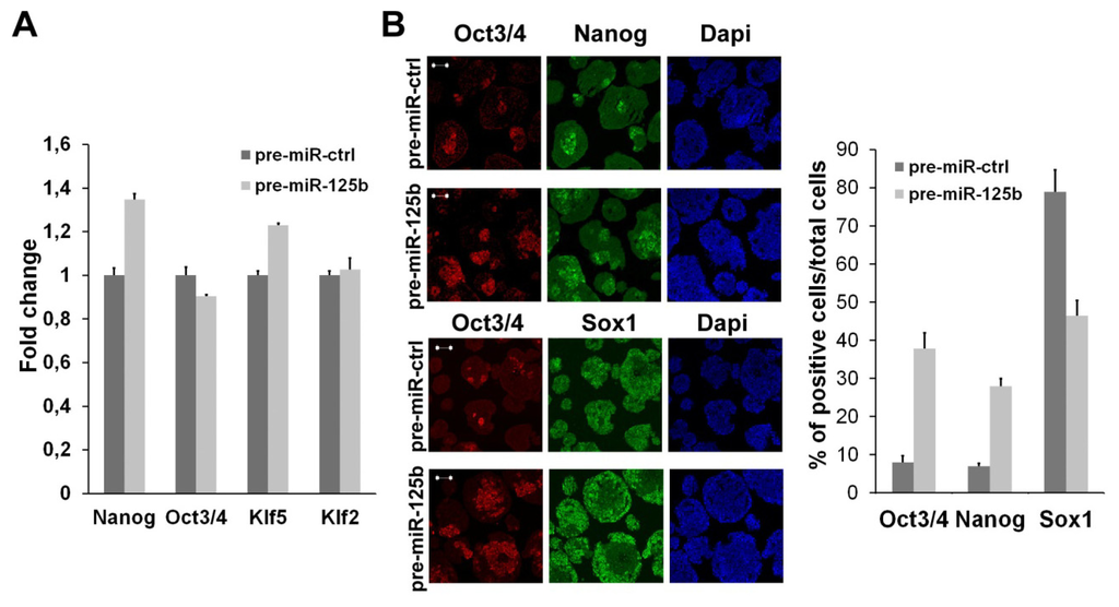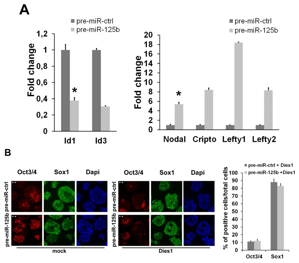 Embryonic stem cells (ESCs) have the unique characteristics of self-renewing in culture and generating a wide range of specialized cell types upon differentiation cues. For their characteristics, they represent an appealing system to study embryonic development and, more importantly, to obtain functional cells for replacement therapy. Of course, a precise and detailed knowledge of the gene programs regulating ESC fate is necessary to allow the use of these cells. Among the signals that regulate ESC fate, there are extrinsic signals, such as Leukemia Inhibitory Factor (LIF) and Transforming Growth Factor beta (TGFβ). The LIF pathway is already well characterized, and it is required to maintain the undifferentiated state of ESCs [1]. TGFβ pathways, i.e., Bone Morphogenetic Protein 4 (BMP4) and Nodal/Activin, have multiple functions, both in stemness maintenance and during the differentiation [2–6], and they seem to work in a perfectly balanced way, so that a misregulation of one of these pathways has relevant consequences on the other ones [7,8]. Another important and widely studied class of regulators of ESC gene programs are the transcription factors (TFs), which have the important characteristic that one TF may control the expression of numerous genes to execute whole differentiation programs [9,10]. Another emerging cohort of molecules holding the same ability is that of miRNAs, the non-coding RNA assigned to regulate post-transcription gene expression. Like TFs, the temporal expression of miRNAs is highly regulated and responsive to changes, depending on the stem cell status. With the aim of deeply understanding the biology of ESCs and to learn more in the control of their potential, these cells have been profiled using different methods to identify miRNAs that have potential roles in stemness and differentiation [11,12]. These studies have revealed several miRNA families that are highly expressed, specifically, in undifferentiated cells [13], as well as the miRNAs that are specifically expressed when differentiation occurs, such as the well-known family of let-7 [14]. Over the past few years, it has become apparent that the distinctive pattern of miRNA expression seen in ESCs contributes to many of the unique phenotypic properties of these cells. Indeed, the switch from pluripotent to lineage-specific cells is marked by the downregulation of pluripotency markers and the activation of lineage-specific gene expression, which are accompanied by changes in the expression of many miRNAs. Whereas some miRNAs function in promoting exit from the pluripotent state by targeting pluripotency factors, other miRNAs stabilize the pluripotent state [15–18]. The introduction or depletion of miRNAs involved in regulating ESC fate may be useful in inducing differentiation along a particular lineage. Recent discoveries have revealed a model in which miRNA regulatory events are linked with transcription factor and signaling networks that control cell fate and differentiation, modulating their activity through positive and negative feedback loops to modulate stem cell fate decisions [19–21]. We have performed a miRNA profiling in ESCs undergoing neural differentiation, and we have demonstrated that some miRNAs are able to control ESC differentiation by targeting important regulators of chromatin remodeling [22]. Furthermore, we have recently illustrated a model in which miR-125a is linked to the signaling of BMP4 and Nodal/Activin, modulating their activity through negative feedback loops to regulate ESC fate decisions [8]. Another miRNA belonging to the same family of miR-125a is miR-125b. We have analyzed the function of this miRNA, which shows an interesting expression profile during ESC differentiation. In this paper, we show that the modulation of this miRNA results in significant changes of the ESC state. These effects are due to the modulation of BMP4 and Nodal signaling during the first step of ESC differentiation. Moreover, we found that miR-125b, opposite to that observed for miR-125a, does not convey the control from TGFβ signaling.