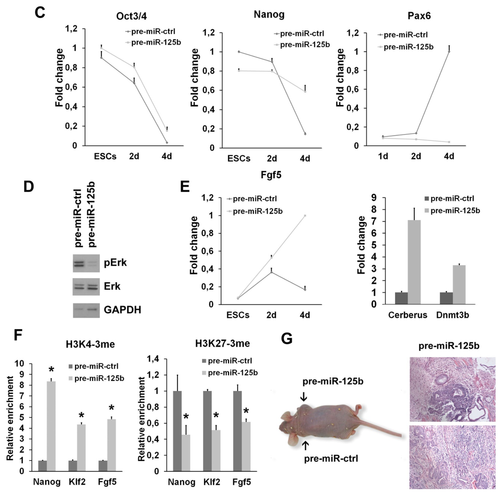 Effects of miR-125 ectopic expression in vitro and in vivo. (A) Analysis of stemness markers (Oct3/4, Nanog, Klf2 and Klf5) in undifferentiated ESCs transfected with pre-miR-125b or with control pre-miR (pre-miR-ctrl). The fold change is calculated by assigning the arbitrary value, one, to the amount found in cells transfected with control pre-miRNA; (B) Immunofluorescence analysis of four-day differentiated SFEBs upon miR-125b overexpression. Markers of pluripotency (Oct3/4, Nanog) and neuroectoderm (Sox1) are shown. Scale bar: 50 μm; (C) qPCR analysis of stemness (Oct3/4 and Nanog) and neuroectodermal (Pax6) markers in differentiating ESCs upon miR-125b overexpression. The fold change is calculated by assigning the arbitrary value, one, to the time point showing the highest amount of the indicated mRNA; (D) The level of active ERK (P-ERK) were analyzed by Western blot in cells transfected with pre-miR-125b or the control pre-miR after four days of differentiation—the experiment shown in the Figure is representative of two independent experiments; (E) The level of the epiblast marker, Fgf5, was measured by qPCR in undifferentiated ESCs and during differentiation upon pre-miR transfection. The epiblast markers, Cerberus and Dnmt3b, were measured at four days of SFEB differentiation in the cells transfected with the indicated pre-miR. The fold change is calculated as indicated in (C); (F) ChIP-qPCR analysis was performed on chromatin from ESCs transfected with the indicated pre-miR and induced differentiation for four days as SFEBs. The graphs show the methylation state of histone H3 on the promoters of pluripotency (Nanog and Klf2) and epiblast (Fgf5) markers. Data are expressed as fold enrichment relative to the control; (G) Immunodeficient mice were injected with ESCs transfected with the pre-miR-125b (right side) and ctrl pre-miR (left side) after three days of differentiation in vitro (left panel). Teratomas generated by ESCs overexpressing miR-125b were explanted after one month, and the tissues were analyzed after eosin-hematoxylin staining (right panels) (*p < 0.05).