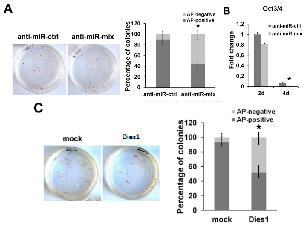 Considering the evident phenotype induced by miR-125b overexpression, we asked if the suppression of this miR may have an effect on ESCs. To analyze the effects of the depletion of miR-125b in ESC differentiation, we suppressed the endogenous miRNAs by transfecting a mix of anti-miR-125a and anti-miR-125b to avoid the levels of endogenous miR-125a from being able to be substituted for the absence of miR-125b. An anti-miR with no complementarity to any known miRNAs was used as negative control. After anti-miR transfection, we cultured ESCs at low density, and after seven days, we performed an alkaline phosphatase (AP) staining to assay their ability to maintain an undifferentiated phenotype. As shown in Figure 4A, the cells transfected with anti-miR-125 showed a reduction in the number of AP-positive colonies compared to the control, indicating that miRNA suppression causes the loss of the undifferentiated state, even in the presence of LIF. Moreover, we found a rapid decrease of the stemness marker, Oct3/4, upon miR-125 suppression during differentiation, already at day two of SFEB formation, which became more evident at day four (Figure 4B). To better define the correlation between miR-125b and Dies1 in this context, we analyzed the effects of Dies1 ectopic expression in ESCs in the same conditions used for miRNA suppression. We found that Dies1 forced expression induces the decrease of the number of AP-positive colonies, thus resembling the phenotype observed upon miR-125 suppression (Figure 4C). These results support the idea that the levels of the two miR-125 are functionally correlated to that of Dies1 in ESCs.