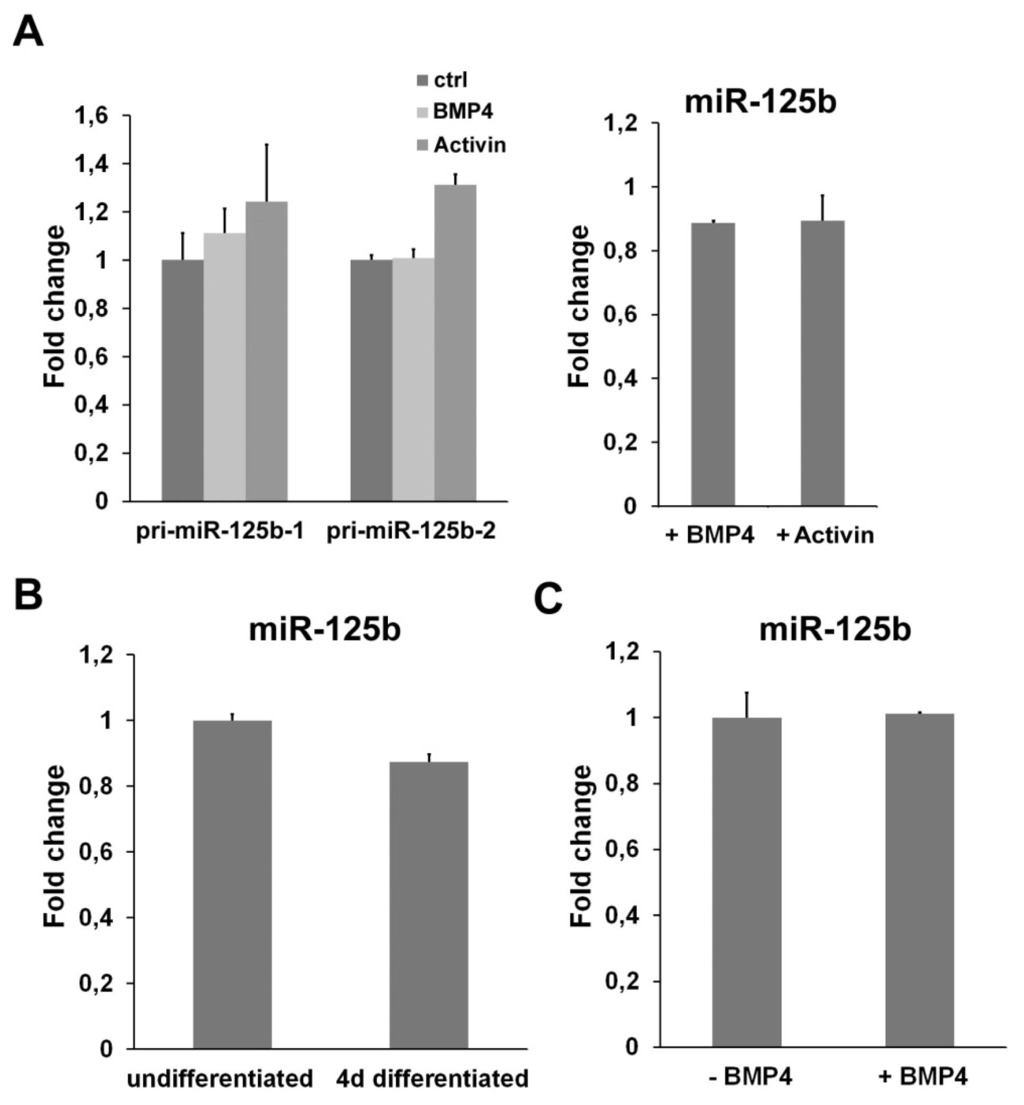 miR-125b expression is independent from TGFβ. (A) Analysis of the level of miR-125b after the exposure of ESCs to BMP4 or Activin. The expression of pri-miRs (left panel) was measured after 1 h of treatment with the indicated molecules by using specific primers that distinguish between the transcripts deriving from the two miR-125b genes (pri-miR-125b-1 and pri-miR-125b-2). The level of mature miR-125b was measured after 24 h of BMP4 or Activin treatment; (B) Expression level of miR-125b in undifferentiated and four-day differentiated C2C12 cells; (C) q-PCR analysis of the expression of miR-125b in C2C12 cells after 24 h of treatment with BMP4. All the data are expressed as fold change relative to the control.
