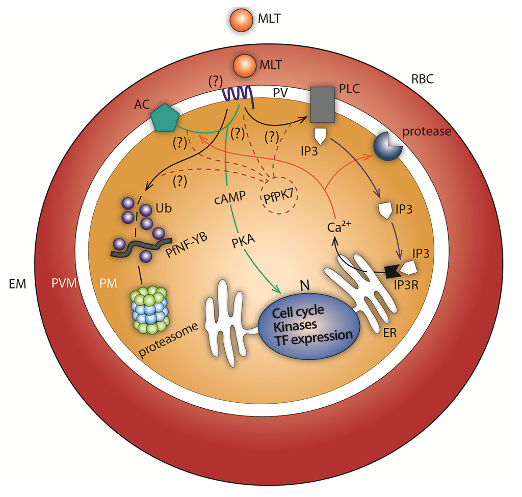 Melatonin molecular signaling pathways in Plasmodium. Melatonin (MLT) crosses the erythrocyte (RBC) surface membrane (EM) and the parasitophorous vacuolar membrane (PVM) into the parasitophorous vacuole (PV). Plasmodium senses MLT from the RBC and a cascade of signaling is initiated through an as yet unidentified melatonin receptor located in the parasite plasma membrane (PM) (?). Melatonin signaling activates phospholipase C (PLC) that induces the production of inositol triphosphate (IP3). IP3 is able to mobilize intracellular Ca2+ from the endoplasmic reticulum (ER) leading to a rise in cytosolic Ca2+ concentration through open ER-localized IP3-sensitive Ca2+ channels. In addition, melatonin signaling activates adenylyl cyclase (AC) producing an increase in cAMP level and further activation of protein kinase A (PKA). PKA is involved in controlling the balance of gene expression in the nucleus (N). Melatonin is also implicated in the activation of gene transcription for the UPS (ubiquitin proteasome system) machinery. Protein kinase 7 (PfPK7) seems to participate in the melatonin signaling pathway since parasites with a knockout of this kinase are not responsive to melatonin treatment, as measured by parasite intraerythrocytic stage distribution and activation of a subset of genes involved in UPS. However, how PfPK7 plays its role in melatonin signaling has not been identified yet. Most recently, it has been shown that melatonin increases ubiquitination of PfNF-YB transcription factor and increases its expression.