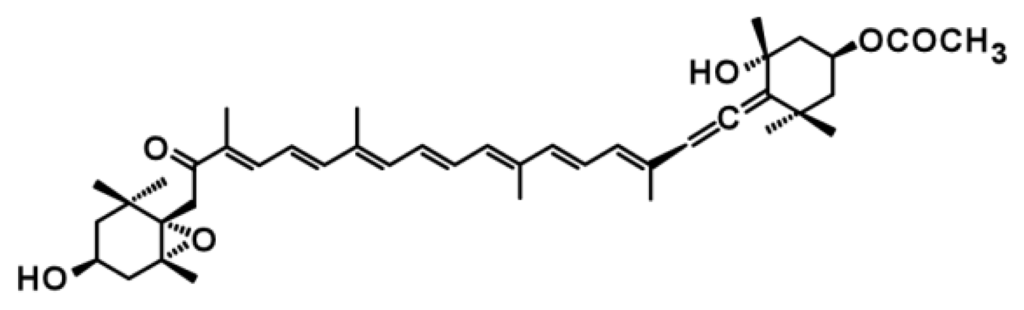 Seaweeds are marine photosynthetic organisms, whose carotenoid profiles are used as a basis for taxonomic classification into green, red and brown algae []. Seaweeds commonly contain β-carotene, a precursor of vitamin A that is absorbed from the diet and is required for normal growth and tissue repair in animals []. Recently, attention has been focused on fucoxanthin, because of its health benefits, such as antioxidant, anti-inflammation, anti-cancer and anti-obesity activities [,]. Fucoxanthin is found in brown seaweeds, diatoms and dinoflagellates and has a unique structure, including an allenic bond, an epoxide and a conjugated carbonyl group in the polyene chain of the molecule (Figure 1), which distinguishes its structure from that of plant carotenoids, such as β-carotene and lutein. However, in contrast to the complete elucidation of the carotenogenic pathway genes in green terrestrial plants [,,], little is known regarding the biosynthetic pathway of fucoxanthin at either the biochemical or molecular biological levels, which hinders lower cost production of this carotenoid through biotechnological approaches. In addition, to our knowledge, the biosynthetic pathways of fucoxanthin in brown seaweeds have not been published, although hypothetical pathways have been proposed for diatoms [–]. Therefore, we summarize here the current status of the understanding of fucoxanthin biosynthesis in brown seaweeds and present the state of knowledge regarding the biological functions of fucoxanthin in human, animal and mammalian cell culture.