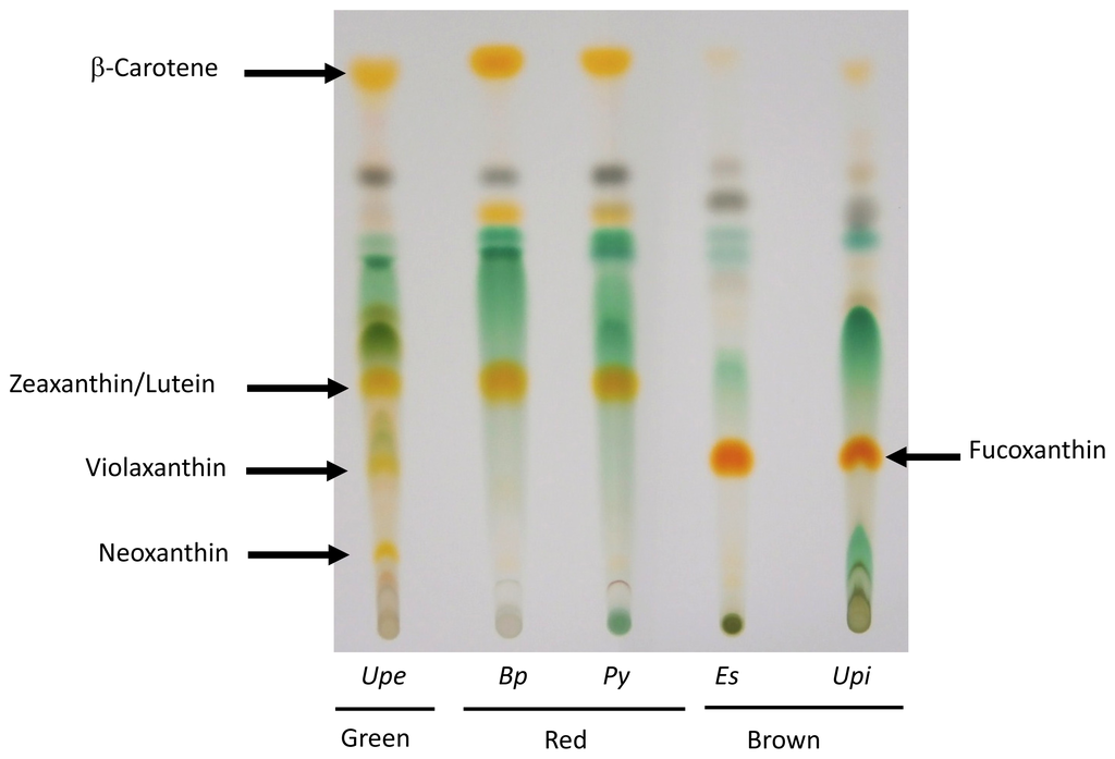 Carotenoids are usually divided into two classes: carotenes and xanthophylls; the latter contains oxygen-containing functional group in its molecular structure. The distribution and color profiles of carotenes and xanthophylls are analyzed by thin-layer chromatography (TLC), although more precise or quantitative analysis requires high-performance liquid chromatography (HPLC). An example of a comparison of carotenoid content in seaweeds by TLC is shown in Figure 2. The chromatogram clearly demonstrates that seaweeds contain class-specific compositions of xanthophylls. For example, red seaweeds contain mainly zeaxanthin and lutein [–], whereas fucoxanthin is the major xanthophyll in brown seaweeds [–]. Green seaweed contains xanthophylls, such as zeaxanthin, violaxanthin and neoxanthin, as found in terrestrial green plants [].