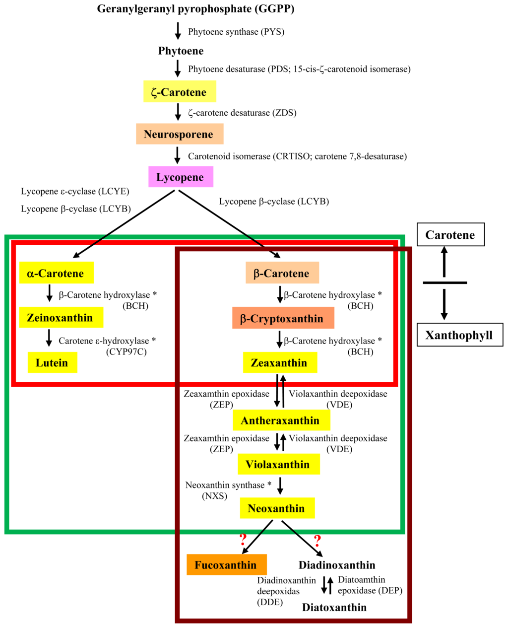 Predicted carotenoid biosynthetic pathway in seaweeds. Red, green and brown boxes reveal the pathway in red, green and brown seaweeds, respectively. The pathways for biosynthesis of zeaxanthin and lutein in red seaweeds and neoxanthin in green seaweeds are proposed based on genomic sequences from Cyanidioschyzon merolae and Chlamydomonas reinhardtii. The color overlapping the name of each carotenoid corresponds to its visible color. The symbol * indicates enzymes unidentified in seaweeds.