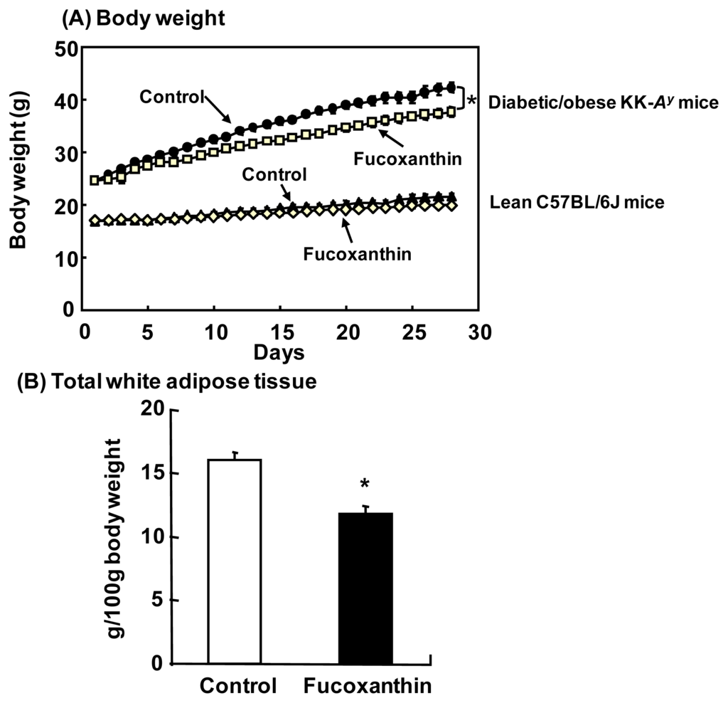 Anti-obesity effects of fucoxanthin on diabetic/obese mice. (A) Body weight of diabetic/obese KK-Ay mice and lean C57BL/6J mice after four weeks of feeding of diets with/without 0.2% fucoxanthin; (B) White adipose tissue weight of KK-Ay mice fed the diet with 0.2% fucoxanthin for two weeks. *p < 0.05 compared with controls.