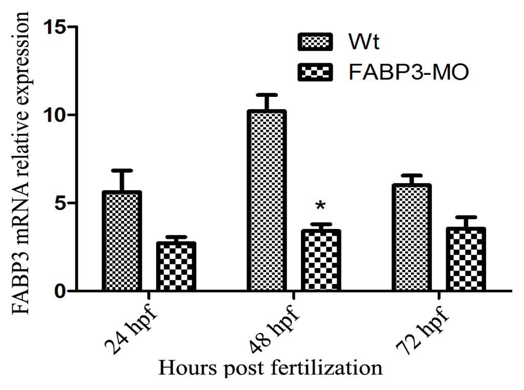 Expression of FABP3 is downregulated in FABP3-MO injected zebrafish. Quantitative PCR validation of FABP3 expression in FABP3-MO injected zebrafish at 24, 48 and 72 hpf and Wt-MO injected zebrafish. Data are representative of three independent experiments; data are expressed as the means ± SD; n = 50 zebrafish embryos per group. *p < 0.05.